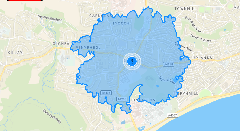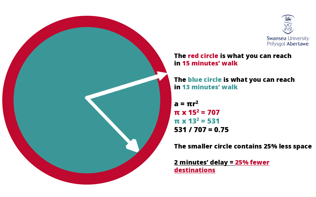 (In reality, of course, unless you live in a desert, the area you can reach in a given period of time is not exactly a circle. If you want to explore the true isochrone map for places you know, there's a handy website for this. For example, this picture shows the places you can reach in 15 minutes' walk from Sketty in Swansea - it's not quite a circle, but a circle is close enough to be a rough model of the zone.)